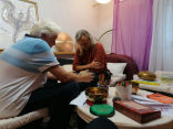1. durch Übertragung von Qi in Anwesenheit des Empfän-gers (durch Handauflegen, wobei der Klient auf einer Mas-sageliege Platz nimmt, sitzt oder steht) oder